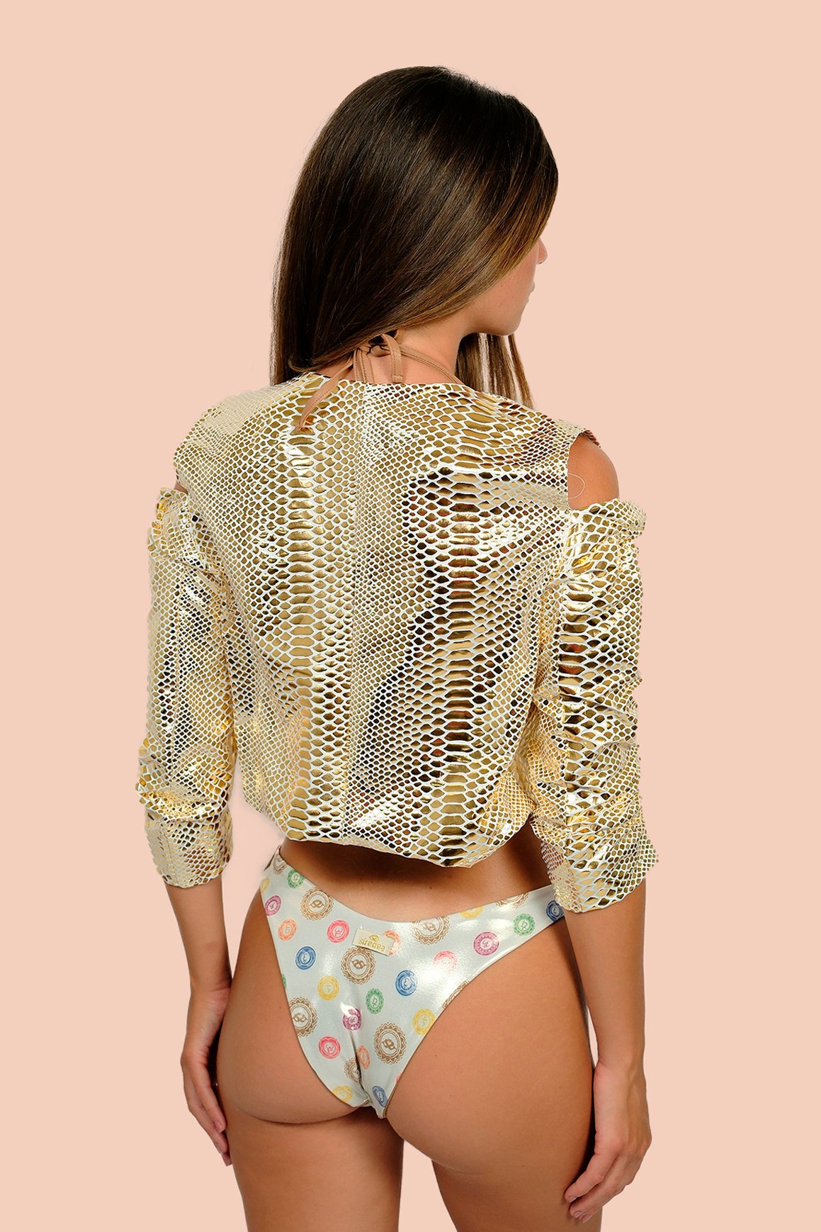 Rendi unico il tuo look da spiaggia con questo esclusivo giacchino placcato in oro dal disegno serpente. Vestibilità normale, ideale sopra bikini o body.