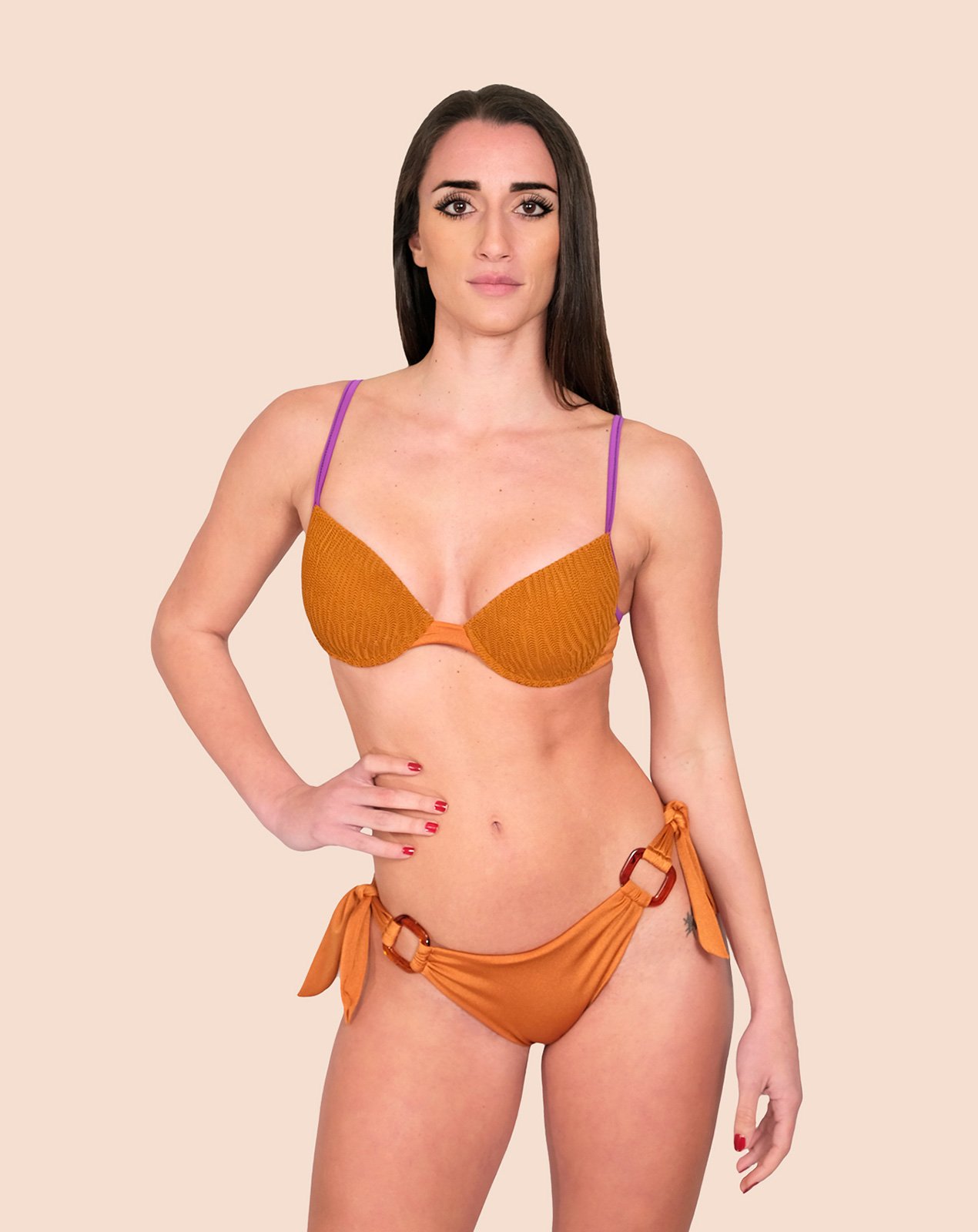 Bikini balconcino push-up in tessuto Ibiza con slip fiocchi e accessori ambrati