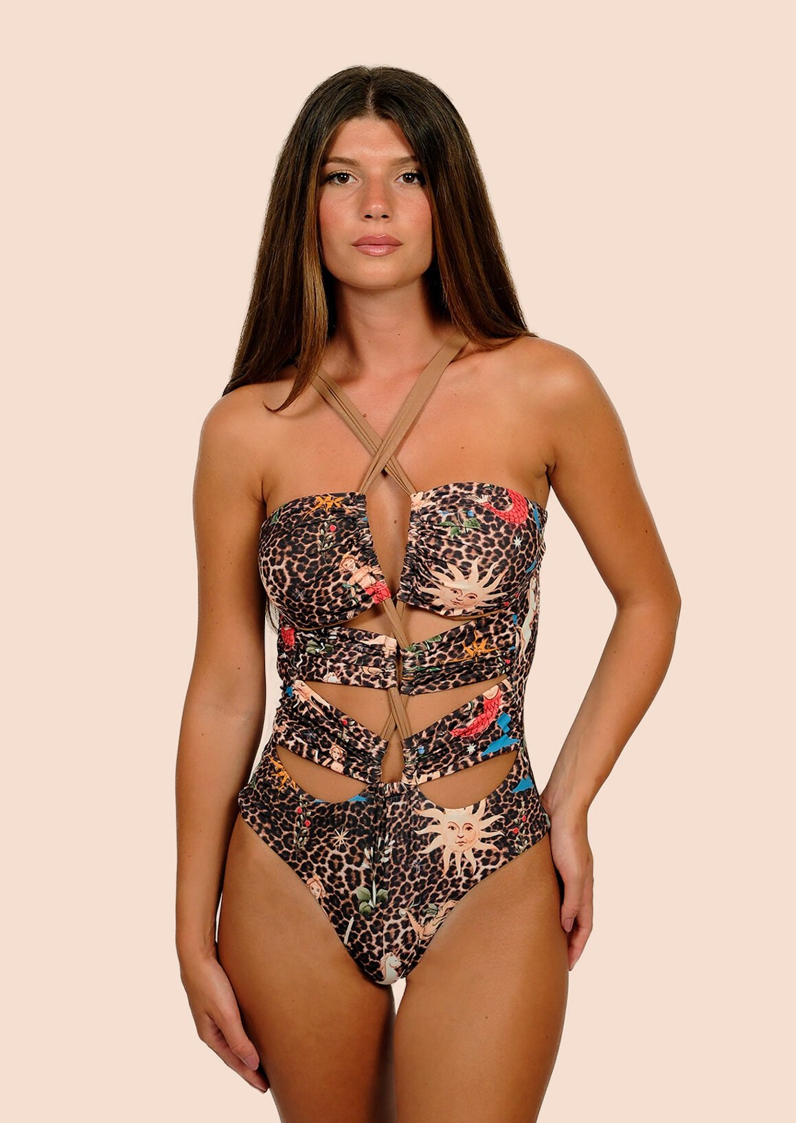 Bikini elegante e strutturato con coppe preformate e ferretti, pensato per un sostegno naturale e una vestibilità personalizzata. Il top presenta chiusura con fiocchi regolabili sulla schiena e spalline larghe per un comfort maggiore. Lo slip taglio a V è sagomato con arricciatura posteriore per valorizzare la silhouette, con stampa animalier e dettagli mitologici iconici del brand Sirédea.
