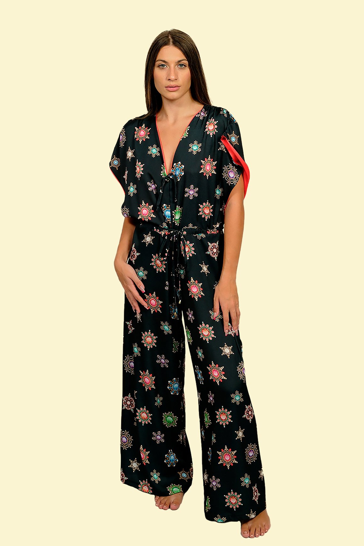 Tuta jumpsuit elegante in tessuto fluido, perfetta per look da resort o per una serata chic. Il modello è caratterizzato da una coulisse regolabile in vita che valorizza la silhouette e da una stampa ricercata su base nera, arricchita da dettagli colorati. La scollatura a V e le maniche morbide donano un tocco sofisticato ma confortevole.