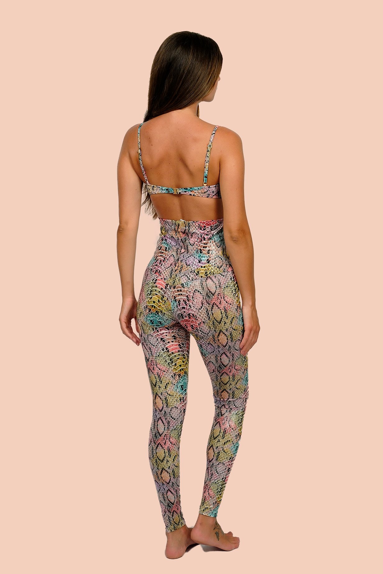 Leggings donna con fascia alta in vita per un effetto contenitivo naturale e una silhouette valorizzata. Realizzati in tessuto elasticizzato con stampa effetto pitonato multicolor, offrono una vestibilità normale e un comfort ideale sia per il tempo libero che per un look coordinato da spiaggia.